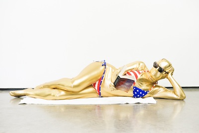 Lyst’s mock-up Zikini is a full-length body sleeve and features a statement bikini or swimwear print over a metallic gold base. The Zikini is also citronella-scented for added protection.