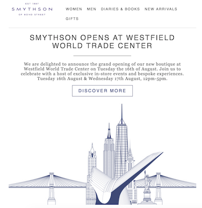 Smythson has shared its anticipation for Westfield World Trade Center’s opening with an email sent to subscribers. In the message, Smythson announced its “new downtown NYC home” and a line drawing of The Oculus and nearby landmark buildings such as 1 World Trade and the Woolworth Building.