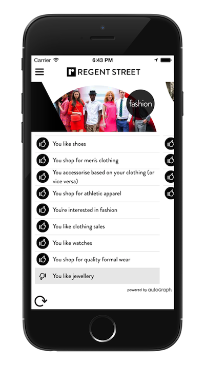 “The app allows each user to only be exposed to the Regent Street offers they’re interested in by utilizing autoGraph’s user-generated profile solution,” he said. “The user does this by swiping up or down on the brand sorter to build their own profile of interests. We rank all of the Regent Street content in order of what is valuable to that specific user.